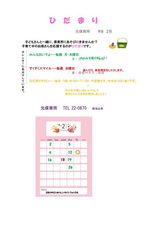 ひだまり(2月) 2026年2月05日 イベント情報 子どもさんと一緒に、保育所にあそびにきませんか? 子育て中のお母さんを応援するのがひだまりです。 みんなおいでよ・・・毎週 月・木曜日 9:00~11:00みんなで遊びましょう! すくすくスマイル・・・毎週 水曜日 9:00~11:00遊んだり、身体測定をしたりします。 ひだまりサロン・・・毎月 1回 9:00~11:00 不定期です。今月は13日(金)です。 元保育所 TEL 22-0870 担当山本 おみせやさんごっこ